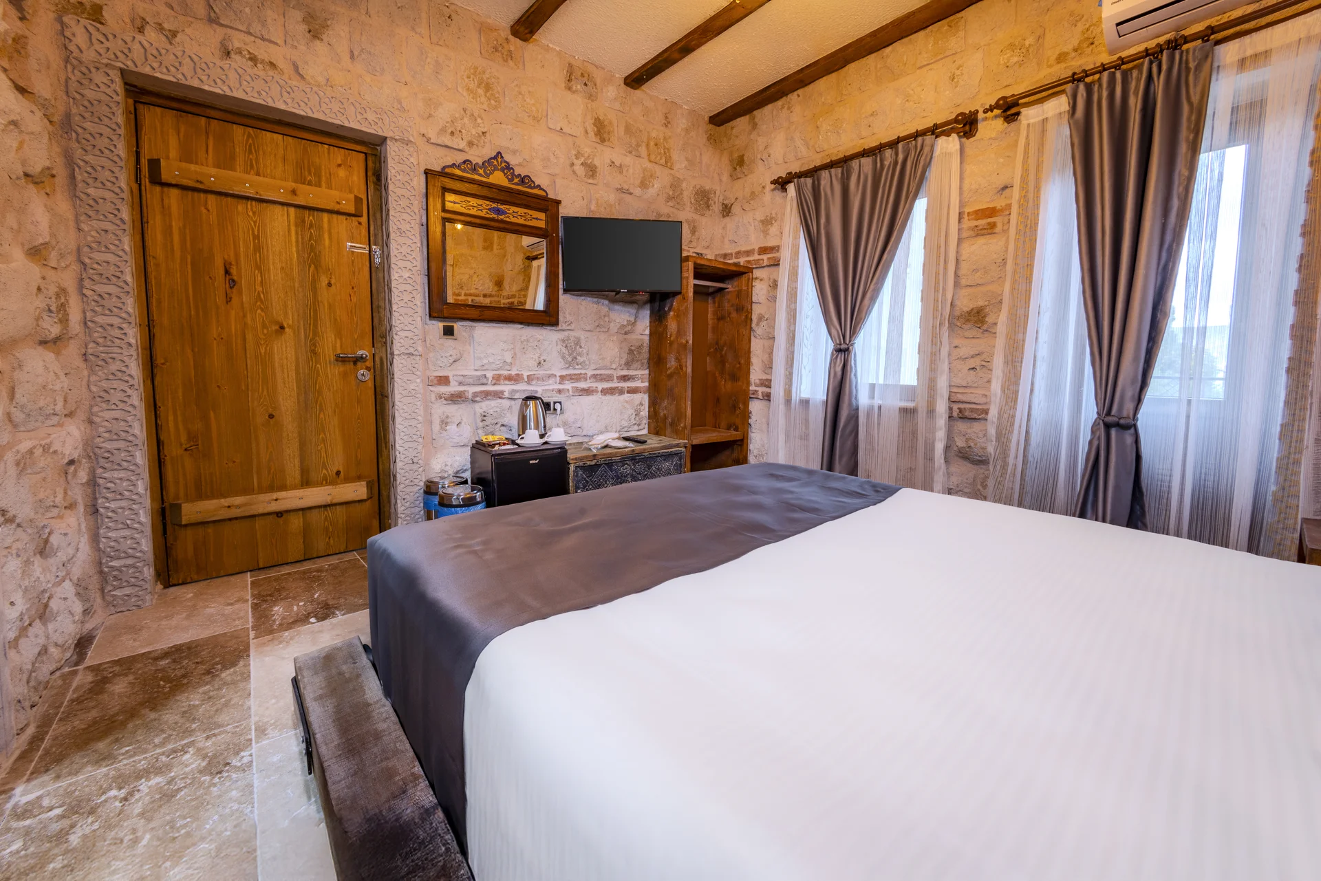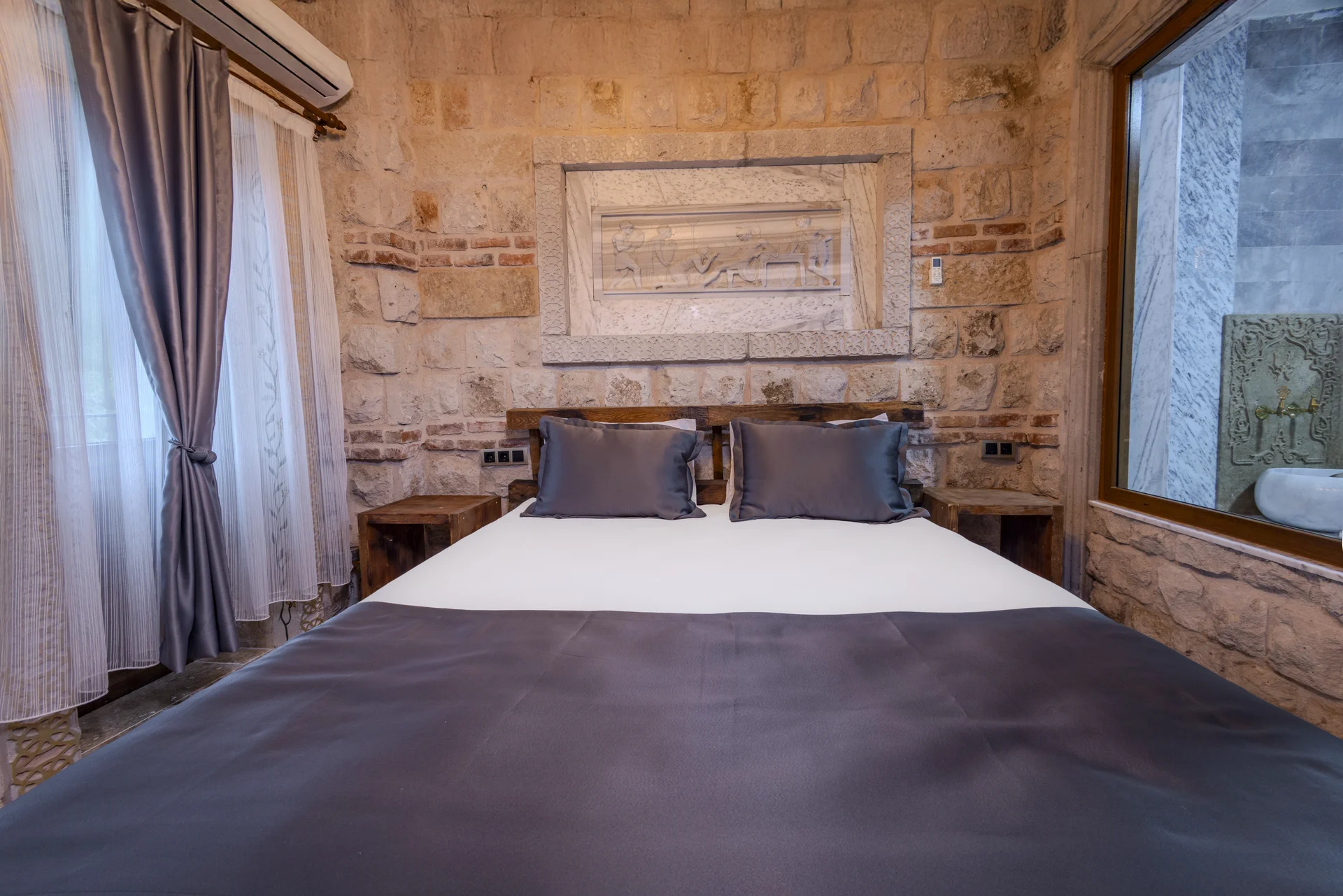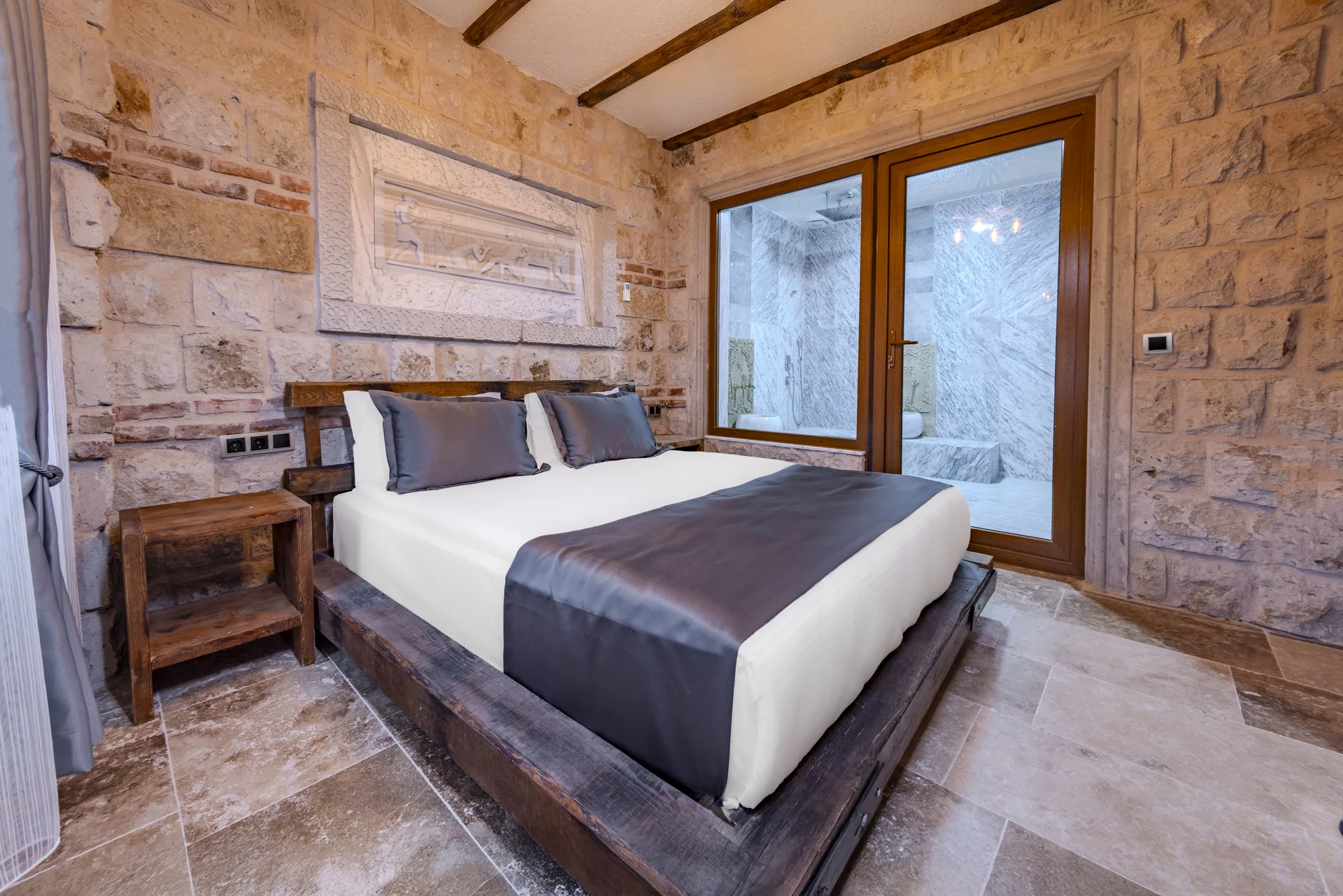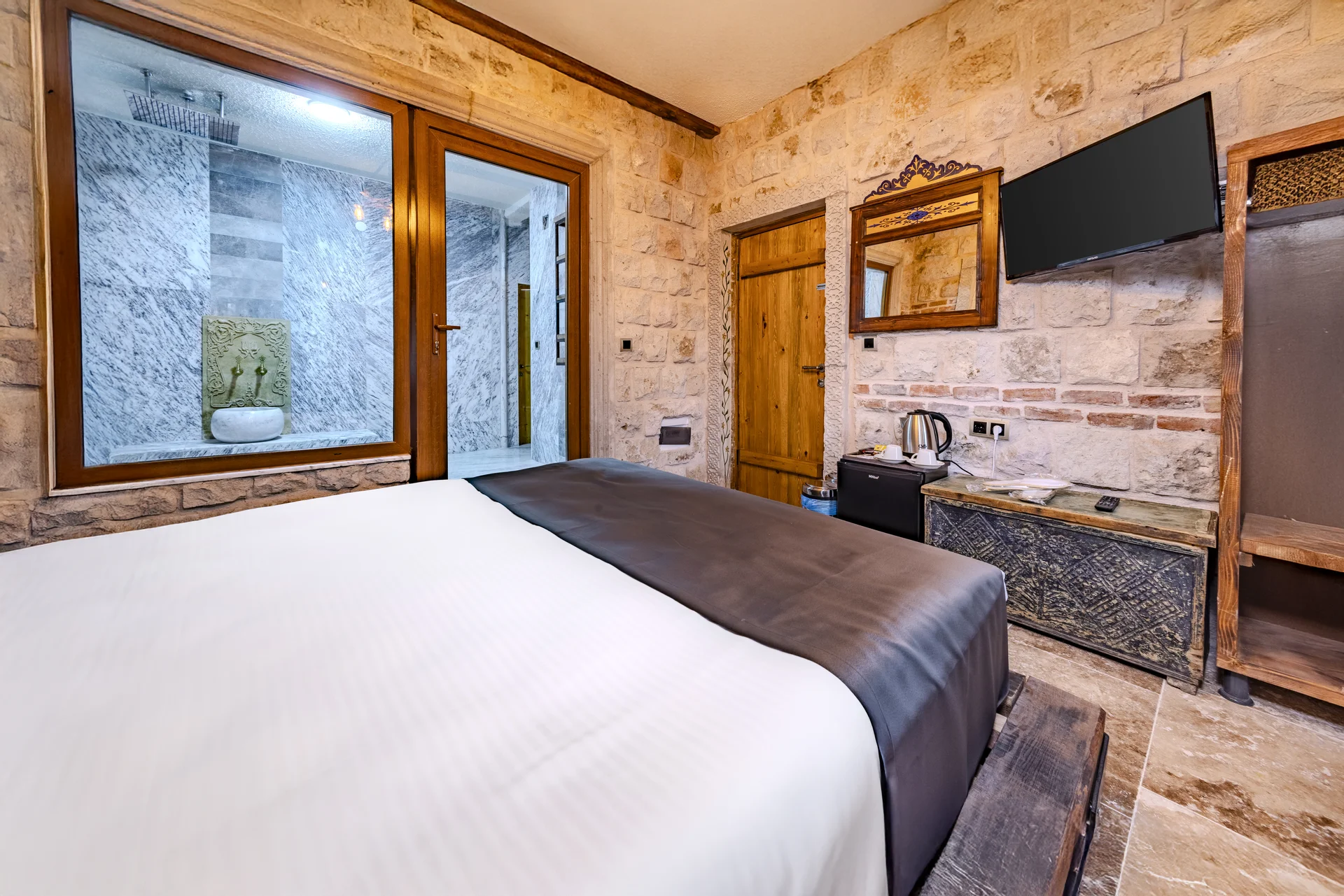 This spacious room features a luxurious jacuzzi for you to unwind and relax while enjoying the beautiful views of Cappadocia. A perfect escape for couples looking for relaxation and comfort in a cozy yet elegant setting.