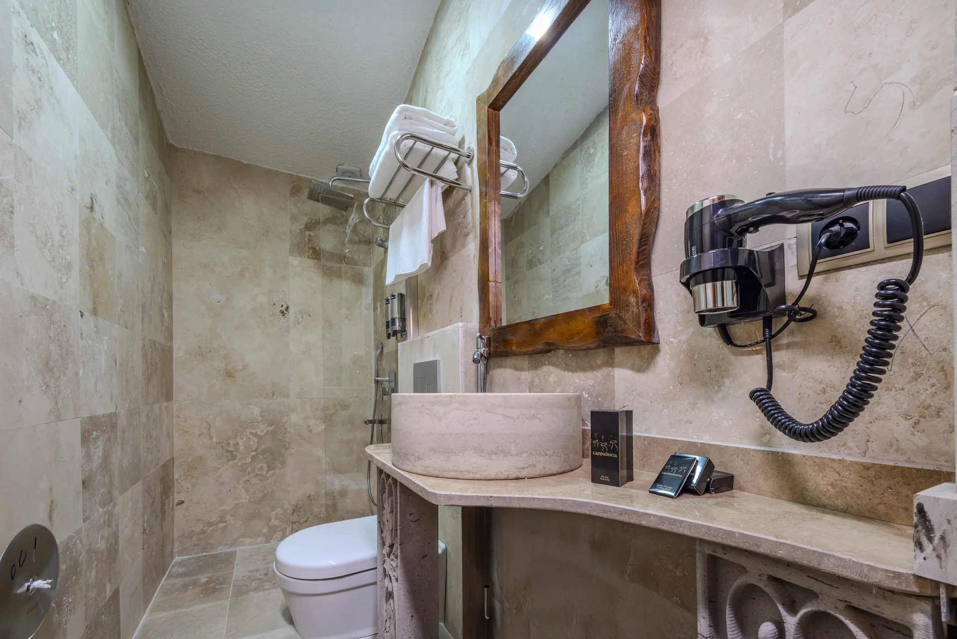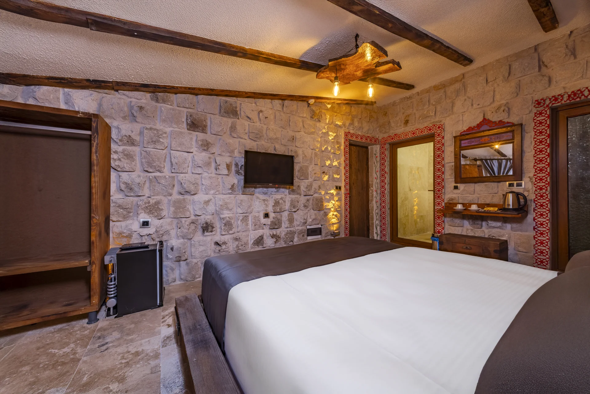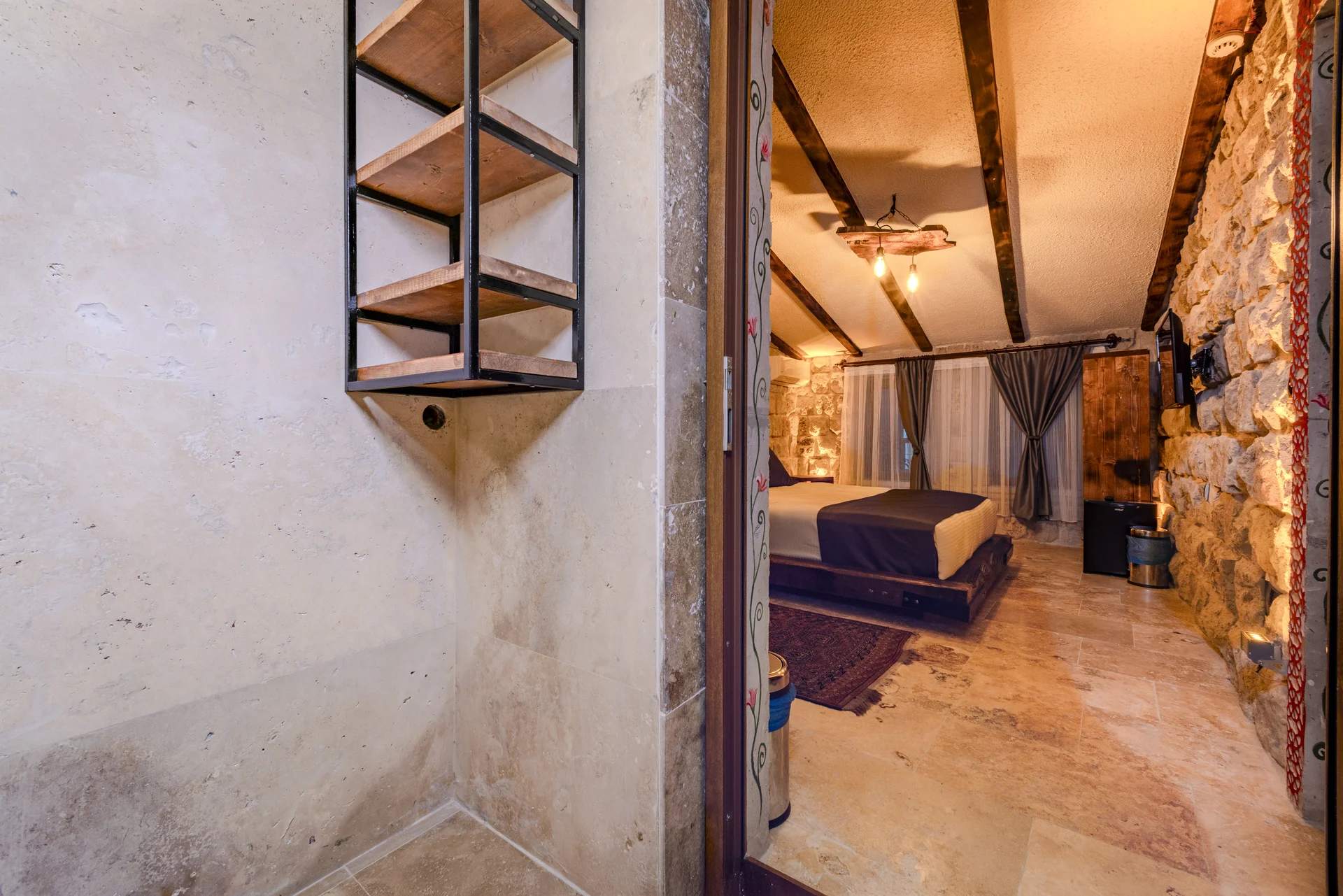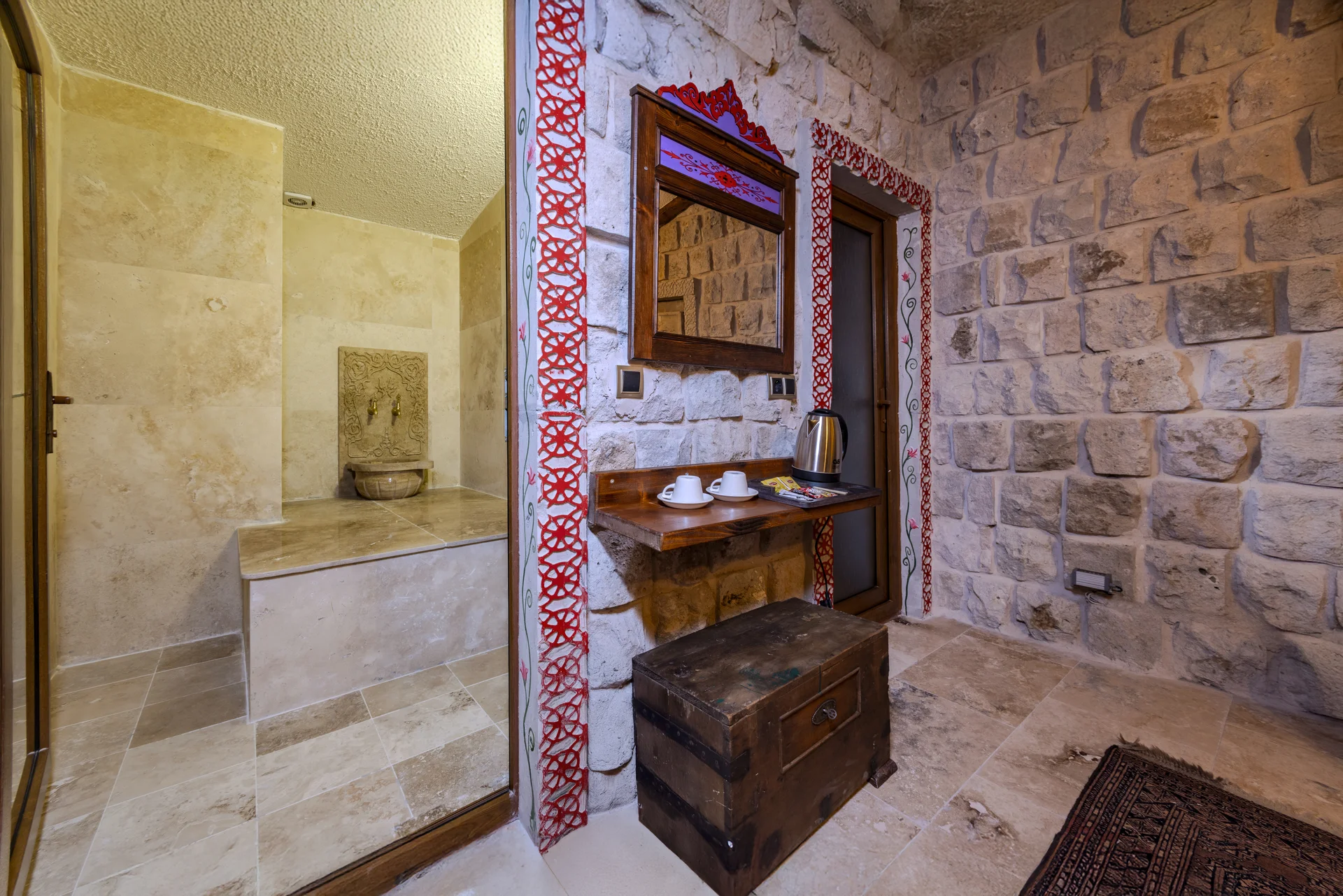 Experience the charm of Cappadocia with this cave-style room featuring a luxurious bathtub. Enjoy a relaxing soak after a day of exploring the region's stunning landscapes. A peaceful haven for those who appreciate rustic elegance and comfort.