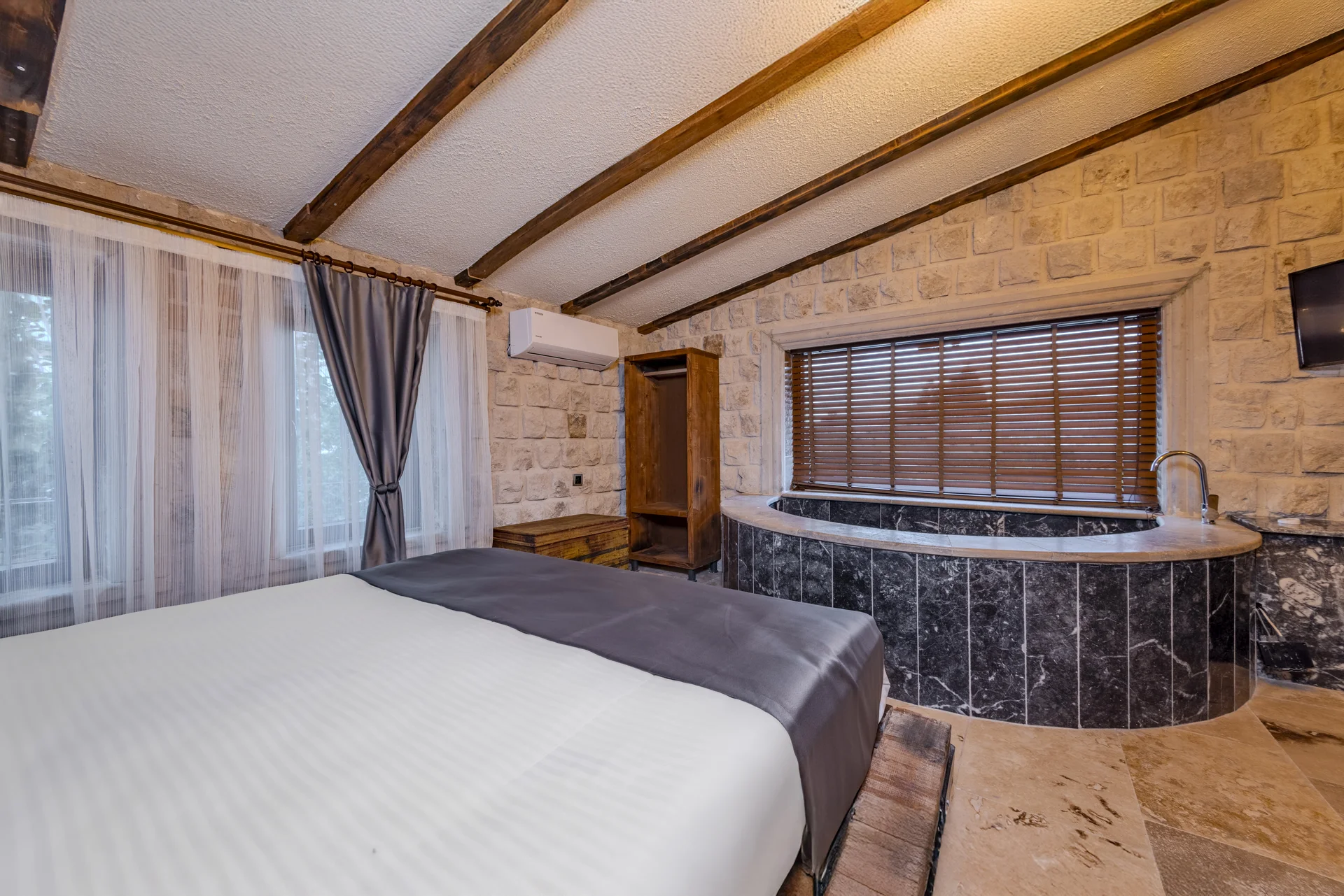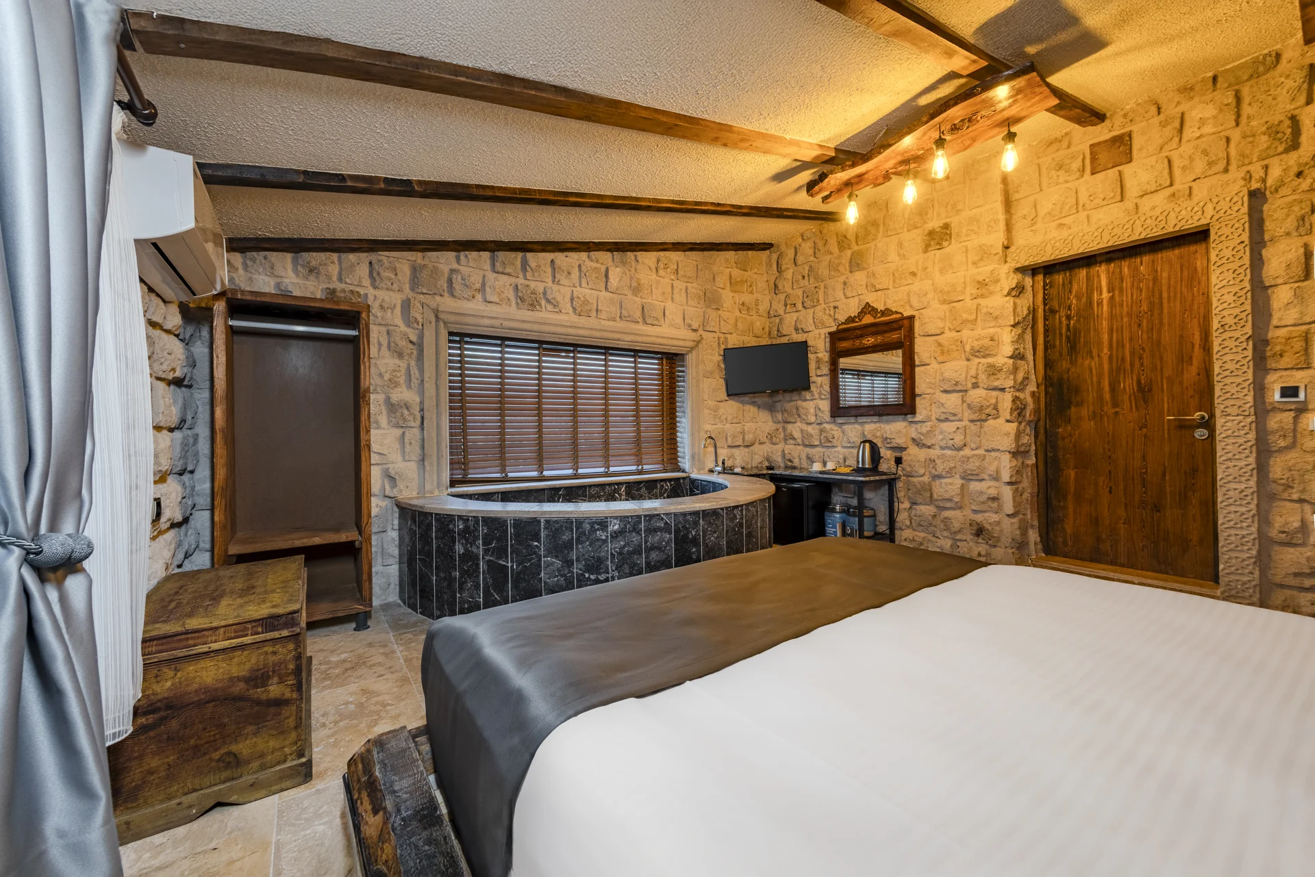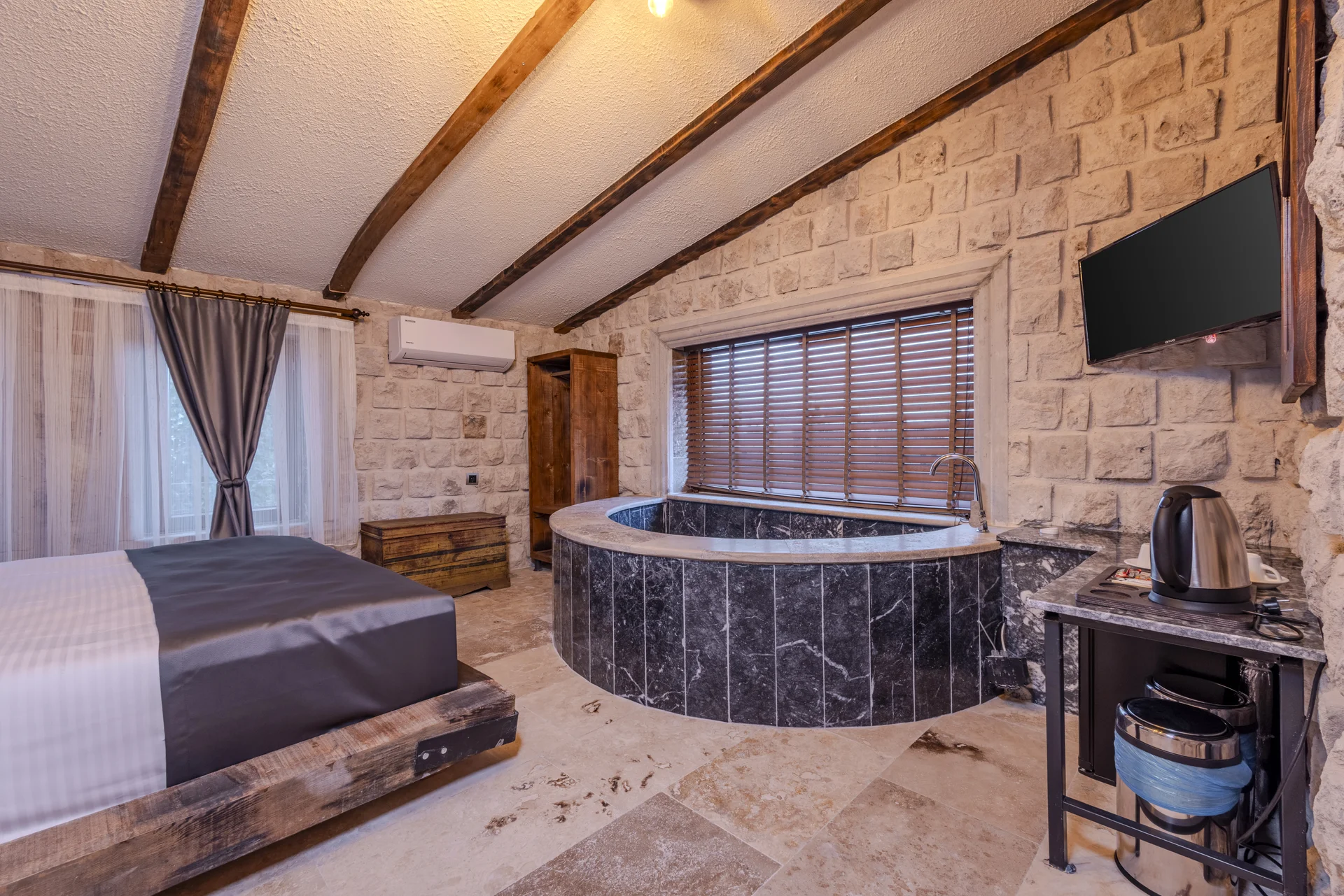 A unique cave room with its own private jacuzzi, perfect for unwinding after a long day of sightseeing in Cappadocia. The combination of rustic stone architecture and modern luxury creates an unforgettable stay.